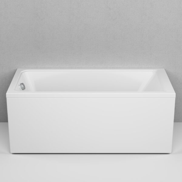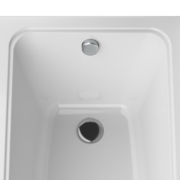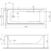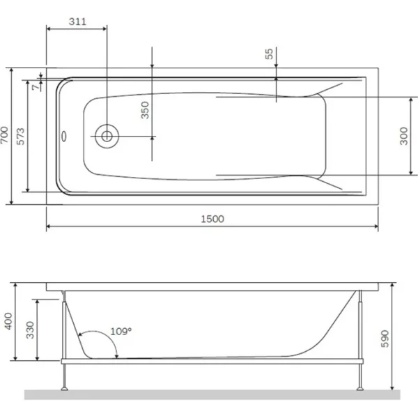 Акриловая ванна белого цвета имеет прямоугольную форму и стандартный (оборачиваемый) тип слива, что делает её универсальной и удобной для установки. Размеры ванны составляют: длина — 1500 мм, ширина — 700 мм, высота — 400 мм. Вес — 15 кг, объем — 149 литров, толщина акрила — 6 мм. В комплект не входят ручки и сифон.