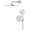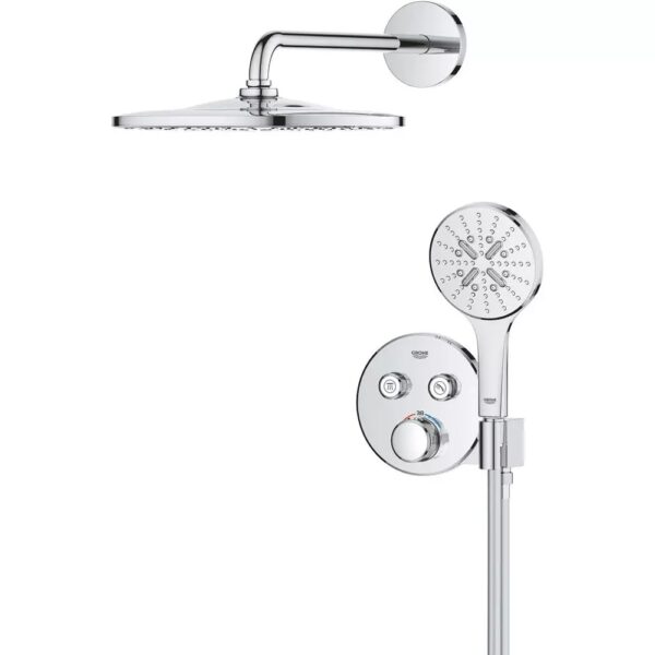 Система оснащена элегантным термостатом скрытого монтажа с двумя выходами и встроенным держателем для ручного душа, а универсальная встроенная часть GROHE Rapido SmartBox обеспечивает скрытую и аккуратную установку. Технология GROHE TurboStat поддерживает стабильную температуру воды на протяжении всего принятия душа, а GROHE Water Saving снижает расход воды и энергии без ущерба для комфорта.