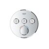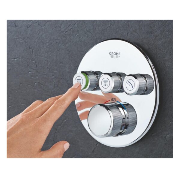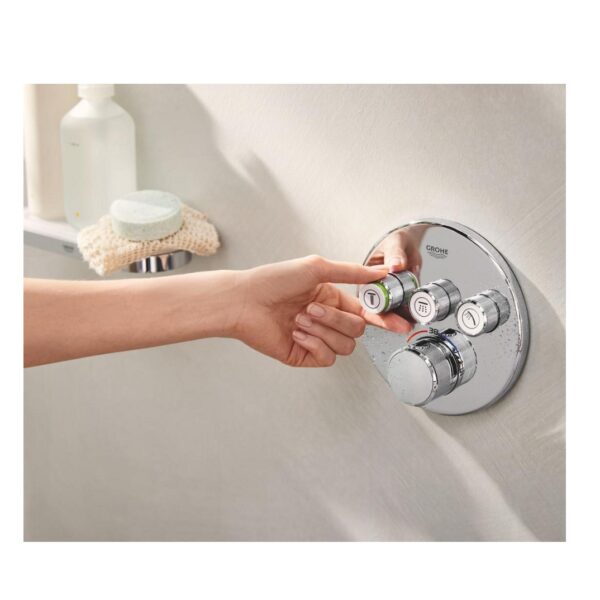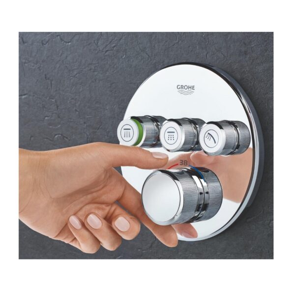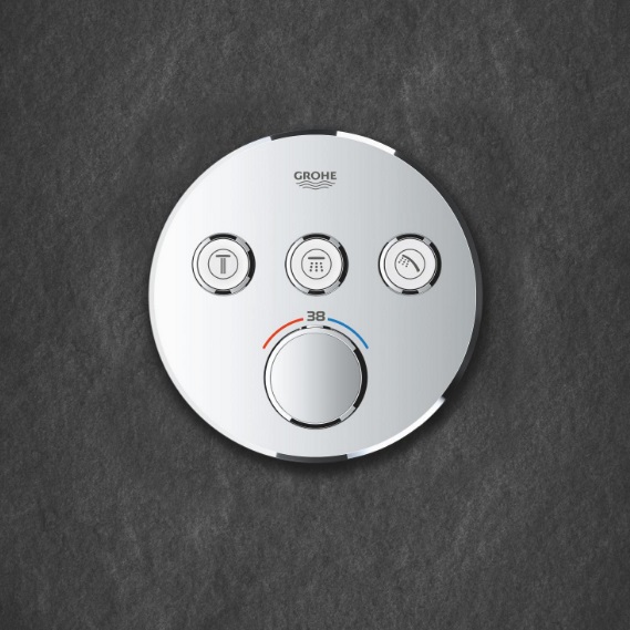 Набор включает в себя термостат скрытого монтажа Grohtherm SmartControl с тремя кнопками управления и комплект верхней монтажной части для встроенной части GROHE Rapido SmartBox 35 600/35 604. Также в комплект входит металлическая настенная накладка из GROHE FastFixation с возможностью подгонки в пределах 6°. Термостат активируется нажатием кнопки Вкл/Выкл, а регулировка водного потока осуществляется поворотом рукоятки, которая регулирует поток от минимального (GROHE Water Saving) до максимального (Full Flow).