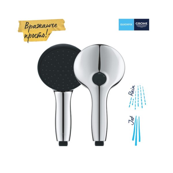 Vitalio Start 110 – ручной душ с двумя режимами струи Rain и Jet, оснащен технологией ограничения расхода воды, роскошным потоком воды и долговечным покрытием GROHE Long-Life. Внутренняя изоляция Inner WaterGuide и силиконовое кольцо ShockProof обеспечивают безопасное использование, а универсальная монтажная система делает его совместимым со всеми стандартными душевыми шлангами.