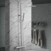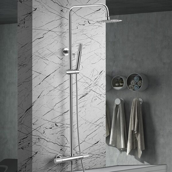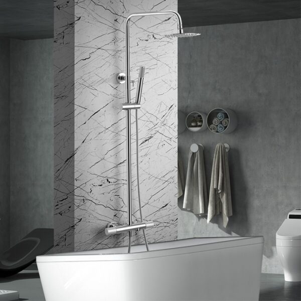 Душевая система оснащена термостатическим смесителем с коротким изливом для наполнения ванны, который автоматически регулирует температуру воды для поддержания постоянной комфортной теплоты воды. Это обеспечивает безопасность, предотвращая ожоги или резкие перепады температуры.