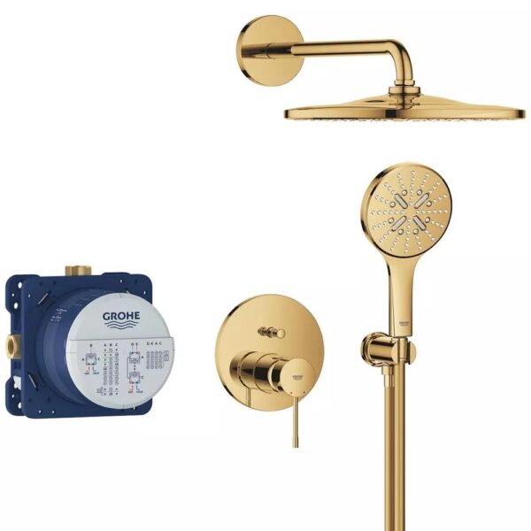 Скрытая душевая система GROHE Essence в изысканном цвете Холодный Рассвет (Cool Sunrise) сочетает элегантность, функциональность и передовые технологии. Этот комплект обеспечивает полный набор для идеального душа, мгновенно придавая вашей ванной комнате стиль и роскошь.