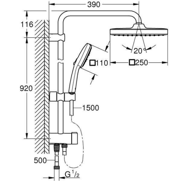 Переключатель на три положения позволяет легко управлять подачей воды: верхний душ, ручной душ или верхний душ в режиме экономии. Система дополнена двумя шлангами Relexaflex: 1500 мм и 500 мм для универсального подключения.