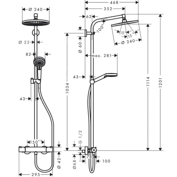 ✔ Верхний душ Crometta S 240 ✔ Ручной душ с двумя режимами струи ✔ Термостатический смеситель Ecostat 1001 CL ✔ Гибкий душевой шланг (160 см) ✔ Регулируемый держатель для душа ✔ Душевая штанга с возможностью регулировки по высоте