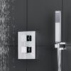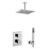 Современный дизайн подчёркивается лаконичными геометрическими формами: квадратная лейка верхнего душа гармонично сочетается с рычагами управления на панели термостата.