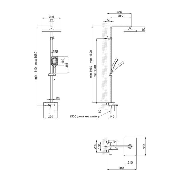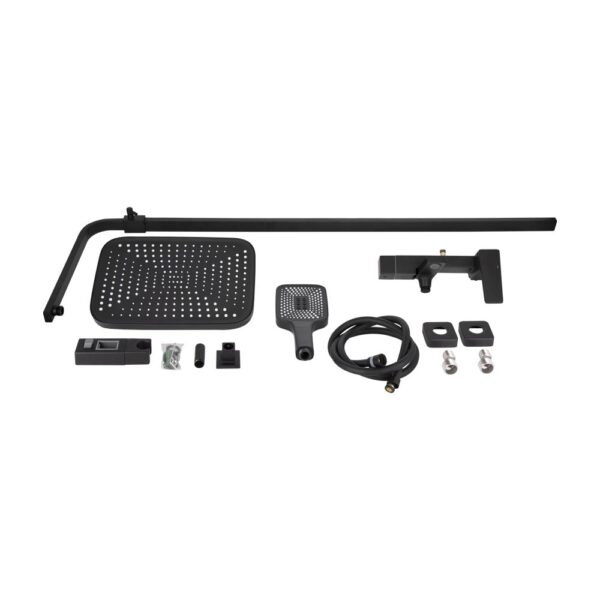 Смеситель, кронштейн для верхнего душа, лейка для верхнего душа, кронштейн для ручного душа, лейка для ручного душа, душевой шланг, шланговое подсоединение, крепежи.