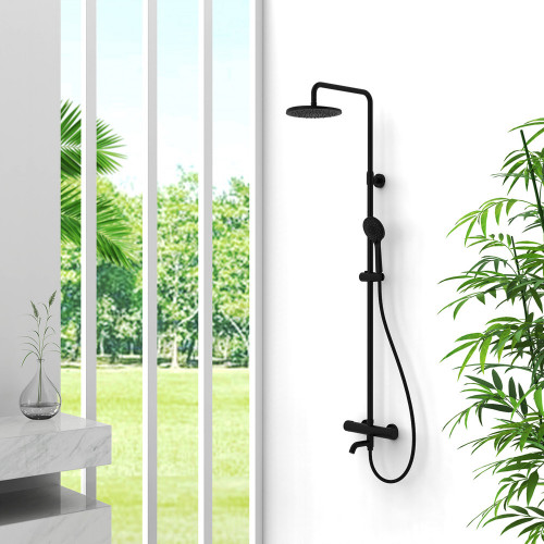 4. Комплектация: Поставляется с полным набором компонентов, включая верхний и ручной душ, держатель для душевой лейки, шланг, душевую штангу, излив и смеситель.