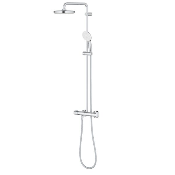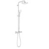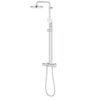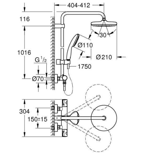 Душевая система состоит из 390 мм горизонтального поворотного душевого кронштейна и настенного термостата с аквадимером. Вы можете выбрать между верхним душем Tempesta 210, который оснащен белой душевой поверхностью, режимом струи Rain, шаровым шарниром и углом поворота ±15°, и ручным душем Tempesta 110 с режимом струи Rain, регулируемым по высоте с помощью скользящего элемента.