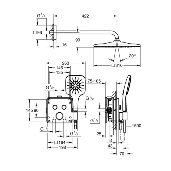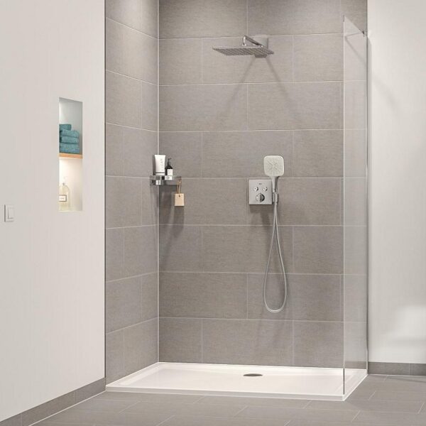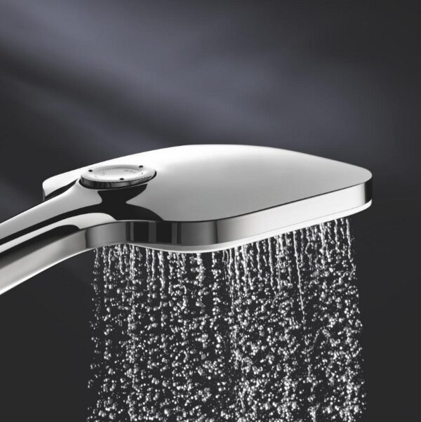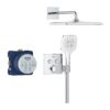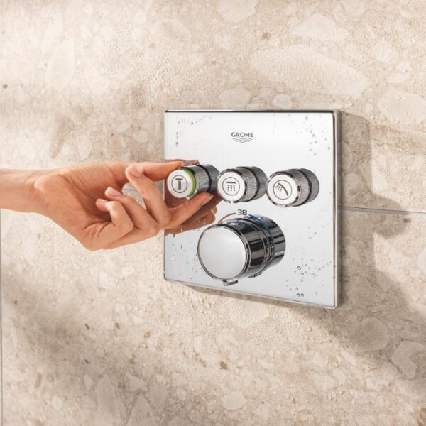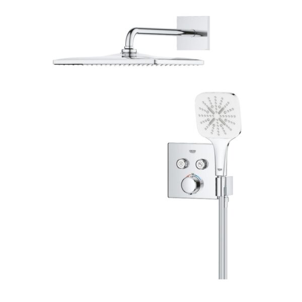 В наборе представлен встраиваемый термостат с двумя кнопками управления и встроенным держателем для ручного душа. Также в комплект входит универсальная встраиваемая часть GROHE Rapido SmartBox диаметром 1/2″ (35 600).