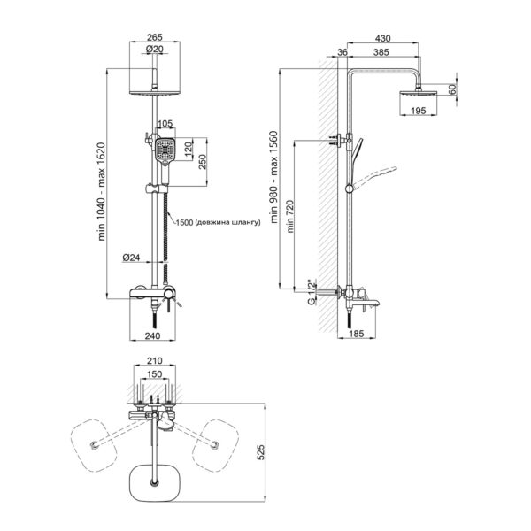 Высота душевой стойки, мм