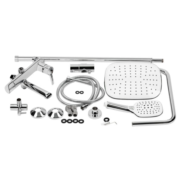 Смеситель, кронштейн для верхнего душа, лейка для верхнего душа, кронштейн для ручного душа, лейка для ручного душа, душевой шланг, душевая стойка, крепежи.