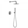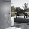 Термостатический смеситель скрытого монтажа на 2 потребителя снабжен картриджем TURN CLEAN SYSTEM, который обеспечивает стабильную температуру воды при каждом купании. Это позволяет избежать резких колебаний температуры и обеспечивает максимальный комфорт во время принятия душа. Внешняя накладка имеет диаметр всего 18 см. Два небольших рычага отвечают за напор и температуру воды. Рычагами удобно управлять даже мокрыми руками. Благодаря переключателю на 2 потребителя он объединяет несколько видов источника подачи воды: верхний и ручной душ.