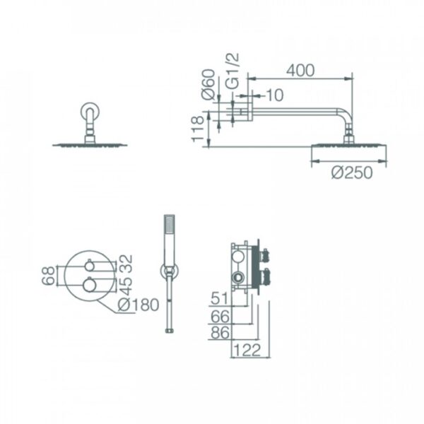 Верхний душ имеет тонкую круглую форму и большую площадь (25 см в диаметре), которая окутает мягким потоком все тело, создавая впечатление тропического дождя. Силиконовые форсунки защитят душ от накипи. Душевая головка прикреплена к изогнутому кронштейну длиной 40 см, который предназначен для настенного монтажа.