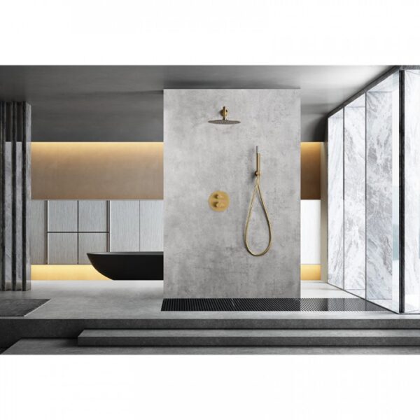 Душевой набор IMEX MONZA PVD BRUSHED GOLD GTM039/OC изготовлен в современном, ультратонком дизайне с золотой отделкой и матовым финишем. Скрытый монтаж деталей делает интерьер более аккуратным и значительно упрощает уборку в душевой комнате, а также экономит пространство благодаря отсутствию выступающих частей смесителя. Матовая отделка золотого оттенка, нанесенная методом PVD, придает не только изысканный внешний вид, но также обеспечивает прочность, стойкость к царапинам и долговечность. Матовый эффект добавляет изысканности и приглушенности, создавая теплую и уютную атмосферу в ванной комнате. Метод PVD — это технология, при которой тончайший слой материала осаждается на поверхность душевой системы при высоких температурах и в вакууме. Этот процесс обеспечивает высокую адгезию покрытия и создает стойкое и равномерное покрытие. Матовая отделка золотого оттенка, полученная методом PVD, обладает высокой стойкостью к царапинам и истиранию, что делает душевую систему более устойчивой к повседневным механическим воздействиям. PVD-покрытие обеспечивает эффективную защиту от коррозии, что важно в условиях влажной среды ванной комнаты.