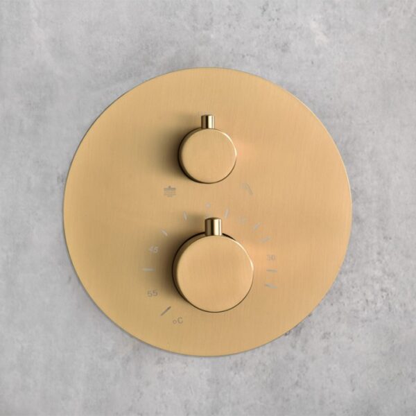 Термостатический смеситель скрытого монтажа на 2 потребителя снабжен картриджем TURN CLEAN SYSTEM, который обеспечивает стабильную температуру воды при каждом купании. Это позволяет избежать резких колебаний температуры и обеспечивает максимальный комфорт во время принятия душа. Внешняя накладка имеет диаметр всего 18 см. Два небольших рычага отвечают за напор и температуру воды. Рычагами удобно управлять даже мокрыми руками. Благодаря переключателю на 2 потребителя он объединяет несколько видов источника подачи воды: верхний и ручной душ.