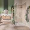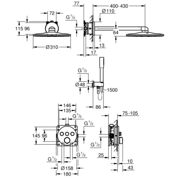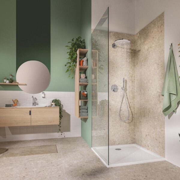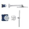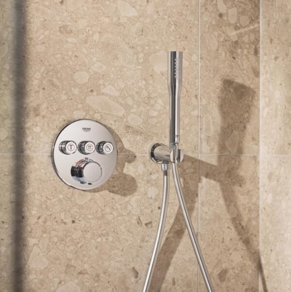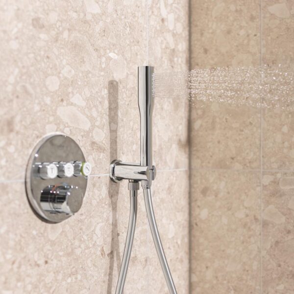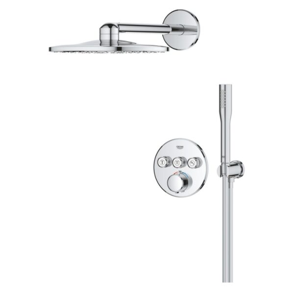 Этот набор включает в себя термостат скрытого монтажа на 3 выхода, GROHE Rapido SmartBox Универсальную встраиваемую часть диаметром 1/2″ (35 600). Также в комплекте имеется верхний душ Vitalio SmartActive 310 с двумя режимами и душевой штангой длиной 430 мм. Ручной душ Vitalio Get Stick с одним режимом и расходом воды 9,5 литра в минуту (27 458) также входит в комплект. Для подключения душевого шланга предусмотрено специальное соединение с держателем. Комплект дополняет душевой шланг VitalioFlex Silver длиной 1500 мм (27 505 000).