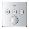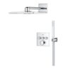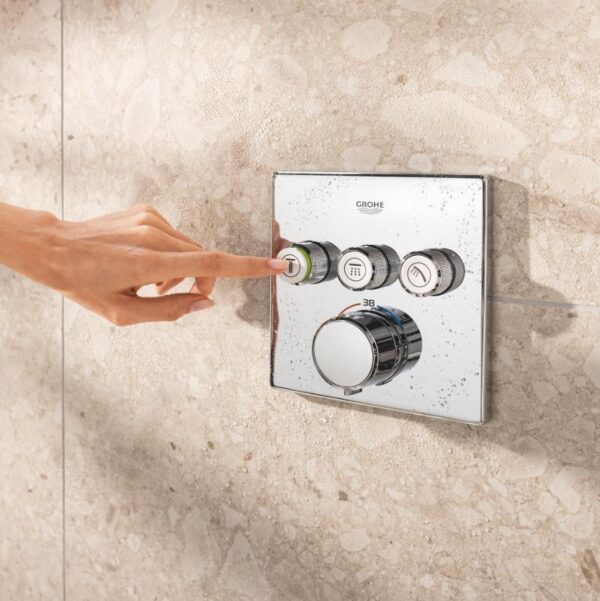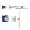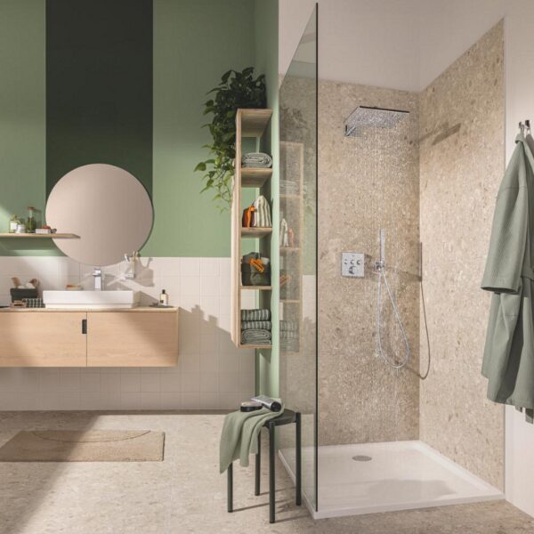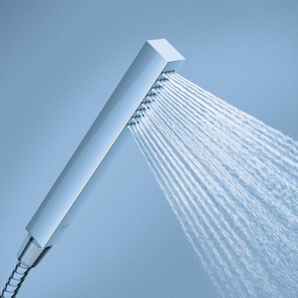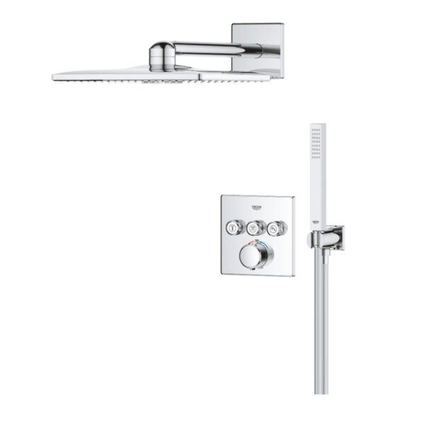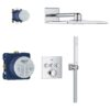 В набор входят термостат скрытого монтажа с тремя выходами и универсальная встраиваемая часть GROHE Rapido SmartBox диаметром 1/2″ (35 600). Также имеется верхний душ Vitalio SmartActive 310 с двумя режимами и душевой штангой длиной 430 мм. Ручной душ Vitalio Joy Cube Stick с одним режимом и расходом воды 9,5 литров в минуту (26 392) также входит в комплект. Для подключения душевого шланга предусмотрено соединение с держателем. Комплект дополняет душевой шланг VitalioFlex Silver длиной 1500 мм (27 505 000).