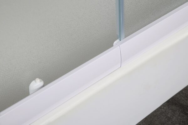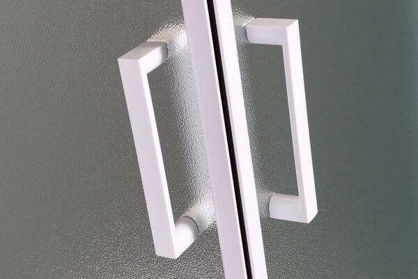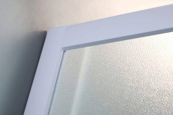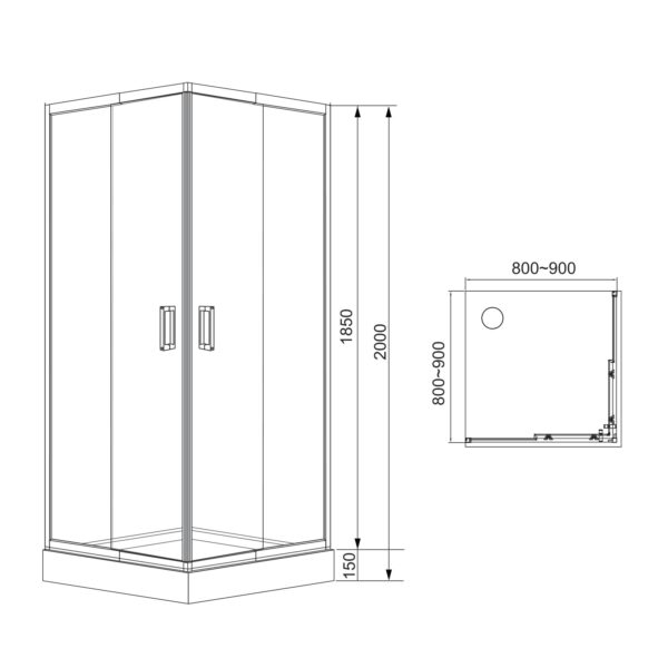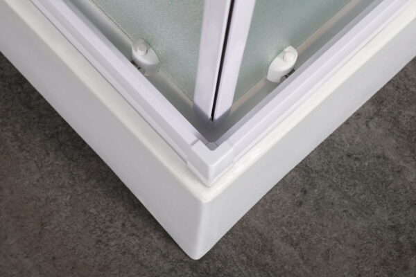 Душевая кабина квадратная с регулируемым профилем в диапазоне от 800 до 900мм. Высота кабины без поддона 1850мм. Профиль алюминиевый белого цвета, позволяет покупателю самому выбирать установочный размер. Тип дверей раздвижные из угла. Каленое стекло «Zuzmara» (разновидность матового). Магнитный металлический замок белого цвета. Качественные металлические отстегивающиеся ролики. Удобные двойные пластиковые ручки белого цвета. Ширина входа в кабину 36 см Душевой поддон и сифон в комплект не входят.