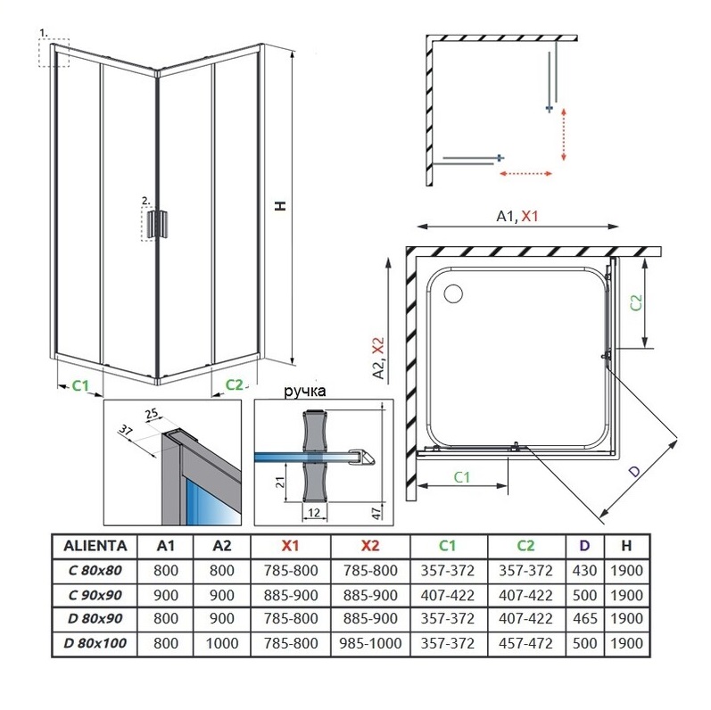 Стандартно кабины предназначены для монтажа на поддоны с конкретными размерами и эти размеры указаны в названии кабины или ее части. Фактические габаритные размеры кабины несколько меньше номинальных размеров, указанных в названии артикула. Если Вы планируете устанавливать кабину непосредственно на полу, обратите внимание на габаритные размеры (X1, X2) и размеры оси стекла (Y1, Y2), указанные на техническом чертеже.