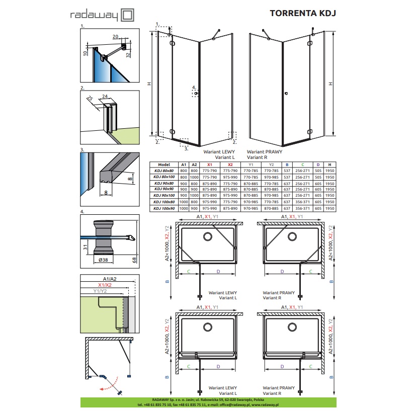Стандартно кабины предназначены для монтажа на поддоны с определенными размерами, которые указаны в названии кабины или ее части. Фактические габаритные размеры кабины немного меньше номинальных размеров, указанных в названии артикула. Если вы планируете устанавливать кабину непосредственно на пол, обратите внимание на габаритные размеры (X1, X2) и размеры до оси стекла (Y1, Y2), указанные на техническом чертеже.
