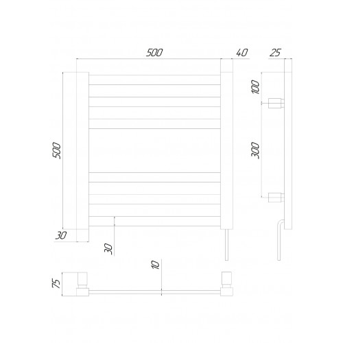 | Особенности | Диаметр стойки — Ø40х25, толщина стойки — 1.2 мм, диаметр перемычки — Ø20, толщина перемычки — 1.2 мм. Максимальная рабочая температура 50-60 °C. Потребляемая мощность 60 Вт. |
