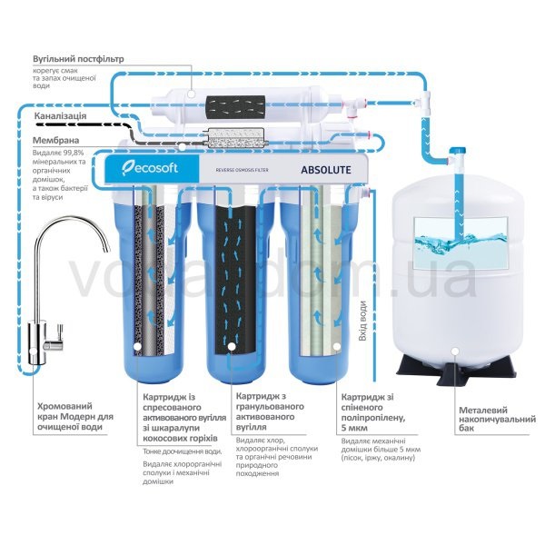 На данный момент технология обратного осмоса является наиболее передовым методом очистки воды в домашних условиях. Ни один другой домашний фильтр не может обеспечить такой же высокий уровень очистки, как системы обратного осмоса. Системы обратного осмоса удаляют из воды до 99,8% всех загрязнений, включая многие виды вирусов и бактерий. Компания Ecosoft из Украины активно работает в сфере водоочистки уже более четверти века, начиная с 1991 года. За это время она зарекомендовала себя как производитель высококачественных продуктов от идеи до конечного товара. Фильтр обратного осмоса Ecosoft Absolute MO575ECO представляет собой последнюю разработку компании, не уступающую мировым аналогам. Основной этап очистки воды осуществляется через полупроницаемую мембрану с порами размером 0,0001 микрона. Благодаря таким размерам, мембрана пропускает только молекулы воды, в то время как 99,8% растворенных примесей задерживаются на ее поверхности. Однако, если вода не будет предварительно обработана, мембрана все равно справится с очисткой, но ее срок службы сократится. Для этого фильтры обратного осмоса оснащаются блоком подготовки воды. После прохождения мембраны обратного осмоса, вода поступает в накопительный бак для обеспечения доступа к чистой воде в любое время. Прежде чем подавать воду из накопительного бака в кран для питьевой воды, она проходит через картридж постфильтра для дополнительной полировки. Очистка воды происходит следующим образом: первым этапом удаляются механические примеси, такие как ил, песок и ржавчина, с помощью картриджа Ecosoft PP5. Второй этап удаляет хлор, используя картридж с гранулированным кокосовым углем Ecosoft GAC. Третий этап удаляет органические примеси и остатки механических загрязнений с помощью картриджа из спрессованного активированного угля Ecosoft CTO10. Четвертый этап — основной, мембрана обратного осмоса Ecosoft 75GPD, удаляет 99,8% растворенных примесей, включая многие виды вирусов и бактерий. Последний этап, пятый, осуществляется картриджем Ecosoft KPostСEco, который удаляет запахи и привкусы из воды после прохождения через накопительный бак, улучшая вкусовые качества воды. Внимание! Для нормальной работы фильтра обратного осмоса Ecosoft Absolute 5-50 давление в водопроводе должно быть минимум 3 бар, если оно меньше необходимо установить помпу для повышения давления. Характеристики:- Тип установки — под кухонную мойку