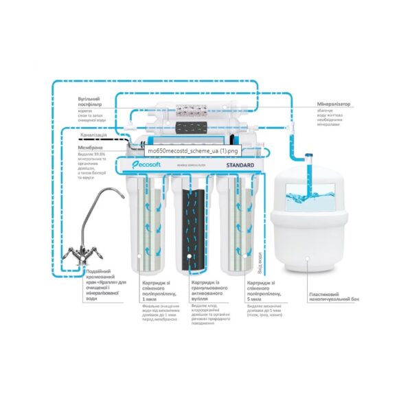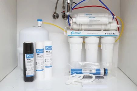 Технологии водоочистки постоянно развиваются, и то, что раньше использовали только крупные предприятия, теперь доступно и для обычных домашних условий. Системы обратного осмоса, ставшие самыми передовыми, могут быть установлены даже в обычной кухне. Они основаны на безреагентной очистке воды, и благодаря микроскопическим размерам пор мембраны обратного осмоса (0,0001 мкм) могут удалить до 99,8% загрязнений, включая вирусы и бактерии. Украинская компания Ecosoft, работающая в области водоочистки уже более 25 лет, с 1991 года, зарекомендовала себя как производитель высококачественной продукции от начальной идеи до готового продукта. Фильтр обратного осмоса Ecosoft Standard 6-50M — это новейшее разработка компании, которая не уступает мировым аналогам. Этапы очистки воды: