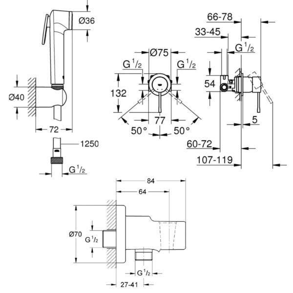 Смеситель поставляется с скрытой монтажной частью. Гигиенический душ Grohe Essence выполнен в черном матовом цвете (модель UA111197243).