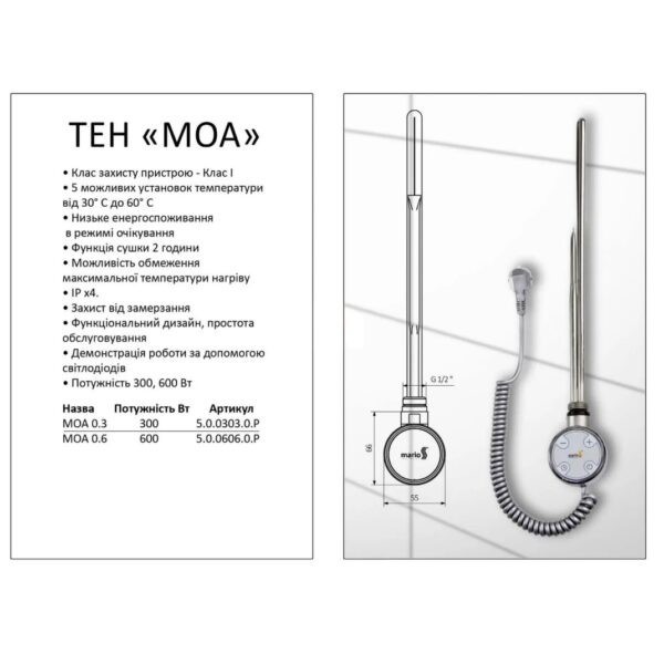 Электронагреватель MOA мощностью 600 Вт относится к премиум-сегменту. Принцип работы: ТЭН нагревается до 60°C, после чего отключается и включается при падении температуры, поддерживая оптимальный нагрев. Оснащен регулятором мощности и таймером на 2 часа.