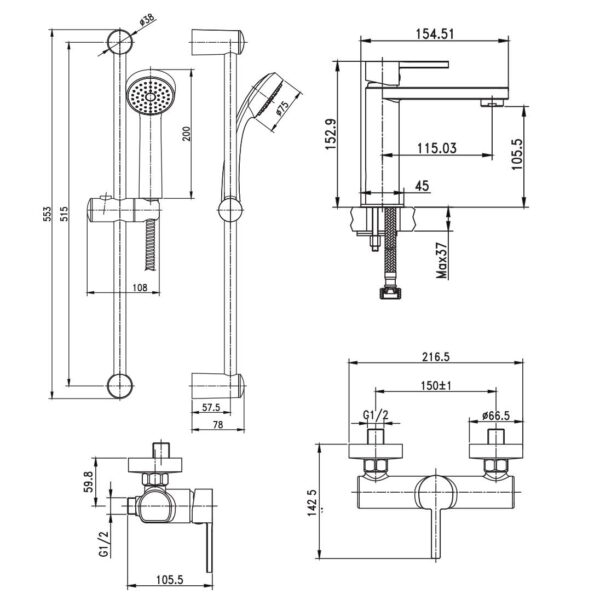 Смеситель для раковины, смеситель для душа, штанга, шланг, ручной душ.