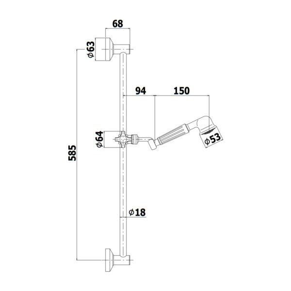Гарнитур оснащен душевой штангой диаметром Ø18 мм и высотой 600 мм, что делает его компактным и удобным для установки даже в небольших душевых зонах. Расстояние между осями крепления — 585 мм, что обеспечивает простоту монтажа и совместимость с большинством стандартных систем.