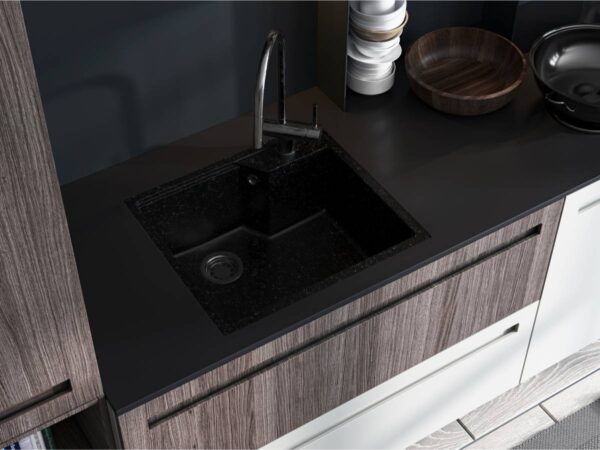 Кухонная мойка LISA black имеет однородную текстуру и цвет. Она не впитывает запахи, отталкивает жир и загрязнения, а также не меняет своего цвета в процессе использования.