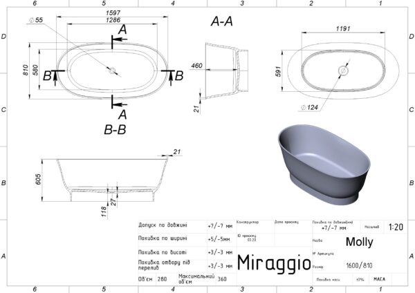 Miraggio имеет большой выбор отдельно стоящих ванн. Ванна MOLLY из литого мрамора — это отдельный вид искусства. Литой мрамор — твердый и долговечный материал. Основным компонентом смеси является молотая мраморная крошка, которую смешивают с полиэфирными смолами. Ванна MOLLY из литого мрамора на внешней поверхности покрывается антибактериальным гелем Gelcoat ISO NPG, который делает устойчивыми к воздействию внешних факторов.