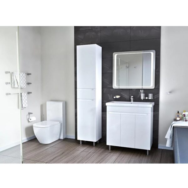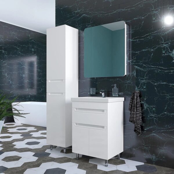 Пенал комплектуется умывальником высокого качества «Cersanit». Корпус и фасад покрыты изолантом, тремя слоями грунта и тремя слоями полиуретановой краски “ICA” (Италия). Завершающий этап включает нанесение двух слоёв лака и ручную полировку в два этапа, что придаёт фасадам торговой марки «Аква Родос» идеальный глянец. Фасад выполнен из МДФ толщиной 19 мм марки «Kronospan». Корпус изготовлен из ДСП марки «Egger» (Австрия), устойчивого к переменам влажности и температурным колебаниям. Фурнитура поставляется от европейских производителей.