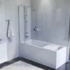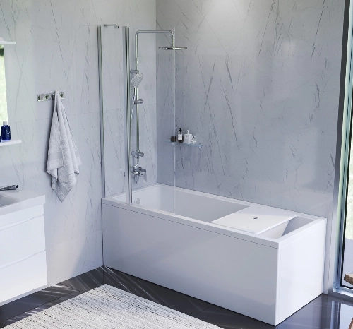 Изготовленная из закаленного ударопрочного стекла толщиной 6 мм, она интегрирована в алюминиевый влагостойкий профиль, что гарантирует долговечность и высокое качество. Шторка полностью защищает от разбрызгивания воды и предотвращает её накопление за пределами ванны.