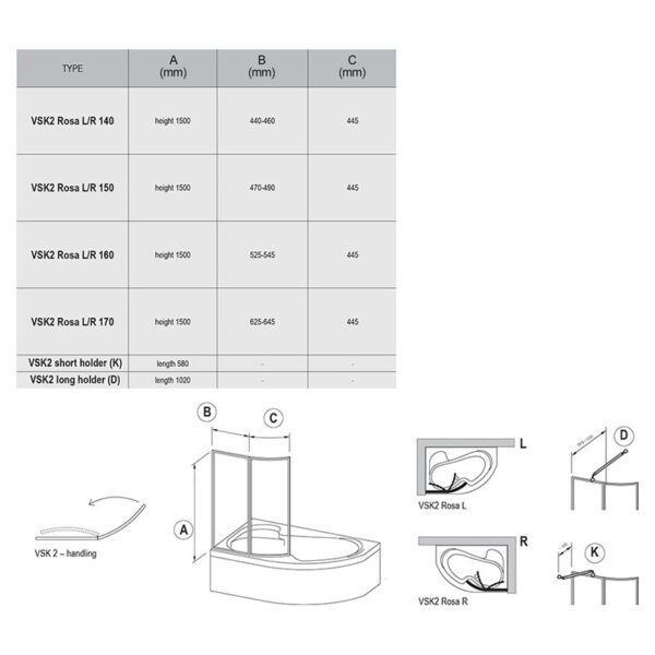 Шторка для ванны RAVAK VSK2 Rosa 140 Rain 76P7010041 правосторонняя