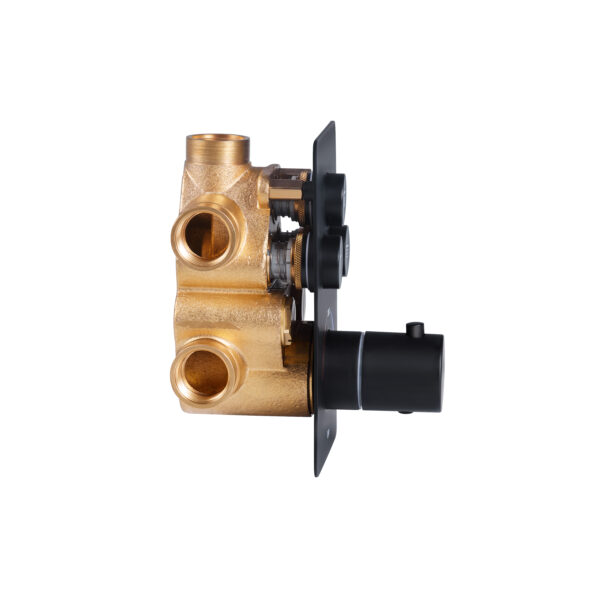 Термостатический смеситель скрытого монтажа для душа Qtap Votice 6443T105NKB на три потребителя — удобное и функциональное решение для современной ванной комнаты. Прочная матовая черная поверхность сохраняет стильный внешний вид на долгие годы, а корпус выполнен из высококачественной латуни, устойчивой к коррозии. Встроенный термостат обеспечивает поддержание предустановленной температуры воды, делая каждое гигиеническое мероприятие максимально комфортным.
