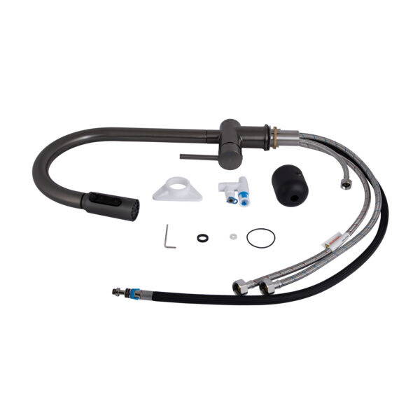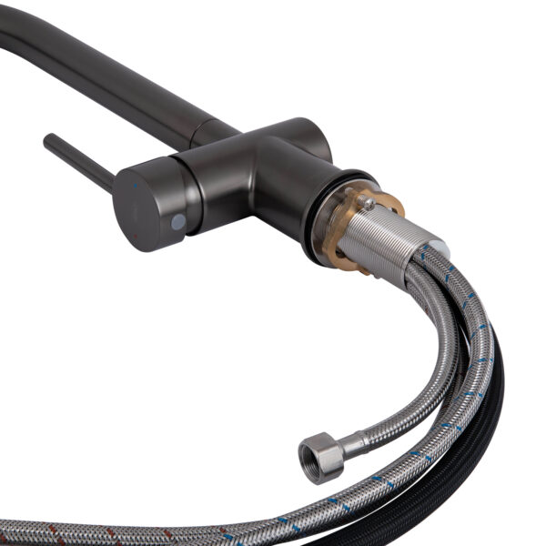 Смеситель для кухни Qtap Rozcesti QTROZ366GMB45939 в элегантном цвете «оружейная сталь» сочетает современный дизайн и высокую функциональность. Выдвижной излив облегчает наполнение крупных емкостей и очистку труднодоступных мест. Подключение для питьевой воды обеспечивает удобный доступ к чистой воде без необходимости дополнительного крана. Надёжное покрытие защищает смеситель от коррозии и механических повреждений, гарантируя долговечность и привлекательный внешний вид.