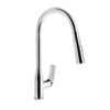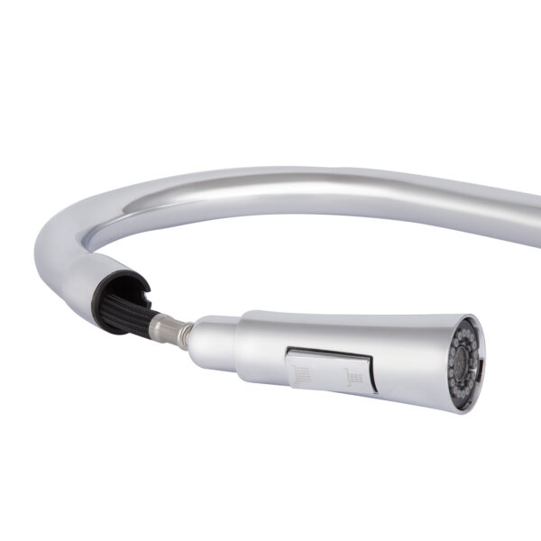 Смеситель для кухни с выдвижным изливом Qtap Vlasta New QTVLA344CRM45646 изготовлен из высококачественной латуни с глянцевым хромированным покрытием, что обеспечивает долговечность и надежность эксплуатации. Выдвижной излив позволяет легко очищать труднодоступные участки посуды и раковины. Управление температурой и напором воды осуществляется с помощью удобного рычага, обеспечивая комфорт и практичность в использовании.