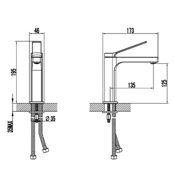 Подвод воды осуществляется с помощью гибких шлангов с диаметром 3/8. Смеситель оснащен керамическим картриджем, что позволяет легко и точно регулировать температуру и напор воды. Однорычажный вентиль обеспечивает простоту в использовании, позволяя одним движением менять параметры воды.