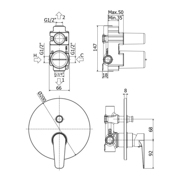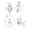 Комплект включает внешнюю и внутреннюю части смесителя, обеспечивая аккуратный и надежный монтаж. Однорычажное управление с переключателем и керамический картридж гарантируют точное регулирование напора и температуры воды. Изготовлен из прочной латуни с глянцевой хромированной отделкой.