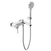 - Комплектация: душевой шланг, ручной душ, смеситель, держатель для душа
