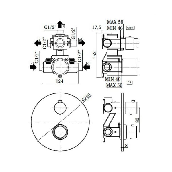 Смеситель оснащен термостатическим картриджем, обеспечивающим стабильную температуру воды и комфорт при использовании. Управление термостатом интуитивно удобное и надежное. Модель рассчитана на подключение трёх потребителей и укомплектована декоративной пластиной диаметром 200 мм.