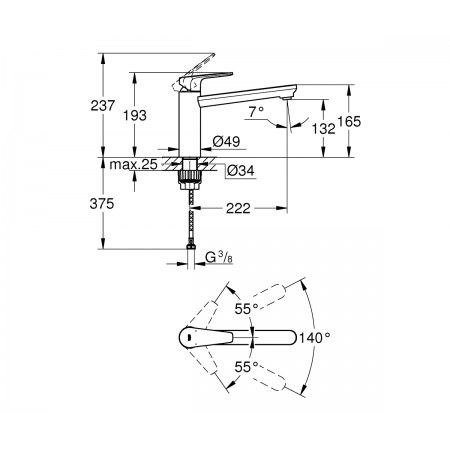 Поворотный трубкообразный излив – удобство в использовании благодаря диапазону поворота 140°.