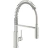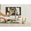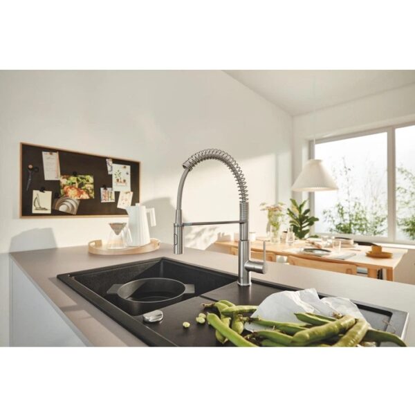 Профессиональная выдвижная лейка расширяет функциональность смесителя, позволяя легко промывать овощи, наполнять крупную посуду и поддерживать чистоту рабочей зоны. Автоматический переключатель между ламинарной струёй и душевым режимом делает использование максимально удобным, а система защиты от обратного потока гарантирует безопасность воды в системе.