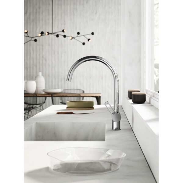Поворотный излив смесителя Paffoni Ringo обеспечивает удобство работы на кухне, а высококачественные материалы гарантируют долговечность и надежность эксплуатации.