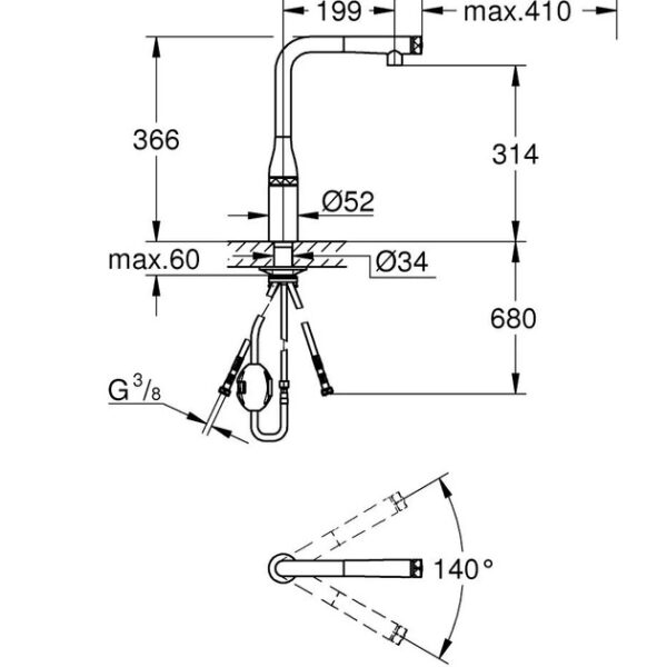 Смеситель обладает поворотным изливом с углом вращения 140°, что делает его отличным выбором как для стандартных, так и для двойных моек. Быстрая регулировка температуры осуществляется при помощи удобного поворотного вентиля на корпусе.