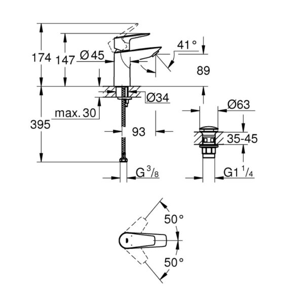 Монтаж смесителя не вызовет трудностей благодаря системе GROHE QuickFix, которая упрощает процесс установки. В комплект входит нажимной донный клапан диаметром 1 1/4 дюйма, выполненный из прочного пластика, а также гибкая подводка для удобства подключения.