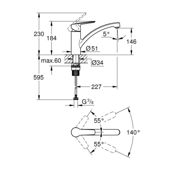 - Вращающийся литой излив с плоскостью вращения корпуса 140° для удобства использования.