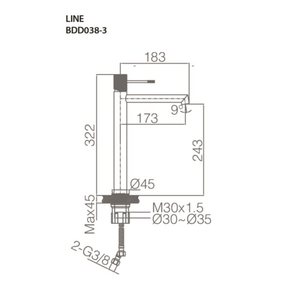 Монтаж смесителя производится через одно отверстие на плите умывальника с помощью гибкой подводки 3/8″, что упрощает процесс установки.